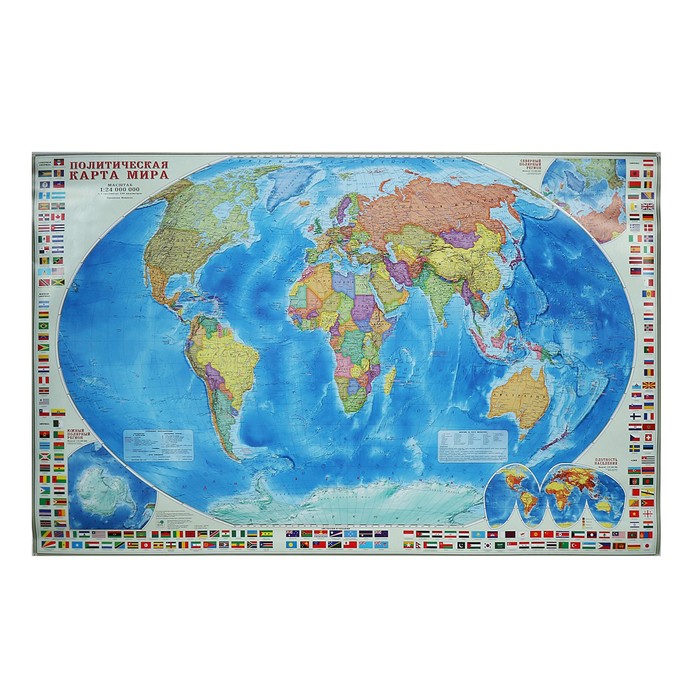 Карта настенная "Мир Политический с флагами", ГеоДом, 124х80 см, 1:24 млн, на рейках