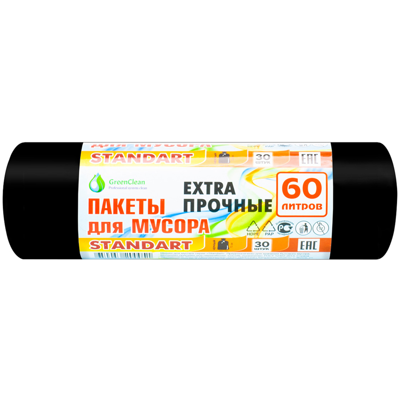 Мешки для мусора 60л GreenClean "Standart" ПНД, 60*70см, 7мкм, 30шт., черные, в рулоне