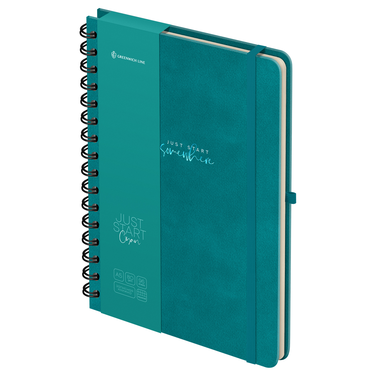 Записная книжка А5 96л., кожзам, на гребне, Greenwich Line "Just start. Cyan", твердая обложка, тиснение фольгой, с петлей для ручки