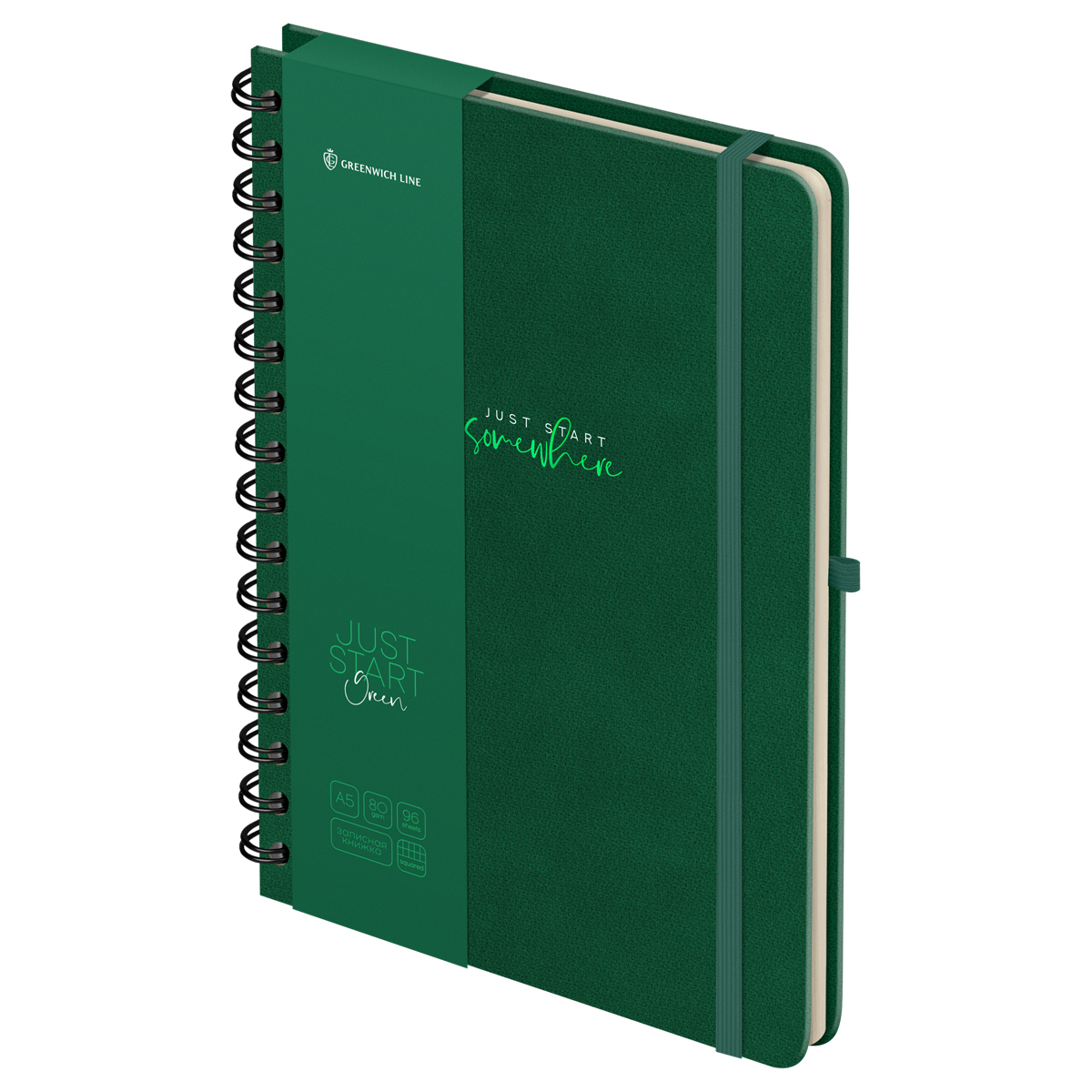 Записная книжка А5 96л., кожзам, на гребне, Greenwich Line "Just start. Green", твердая обложка, тиснение фольгой, с петлей для ручки