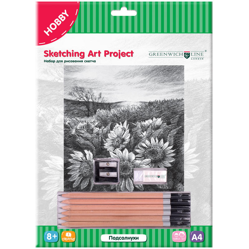 Набор для рисования скетча Greenwich Line "Подсолнухи", A4, карандаши, ластик, точилка, картон
