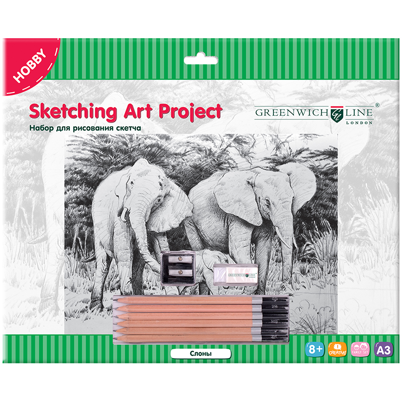 Набор для рисования скетча Greenwich Line "Слоны", A3, карандаши, ластик, точилка, картон
