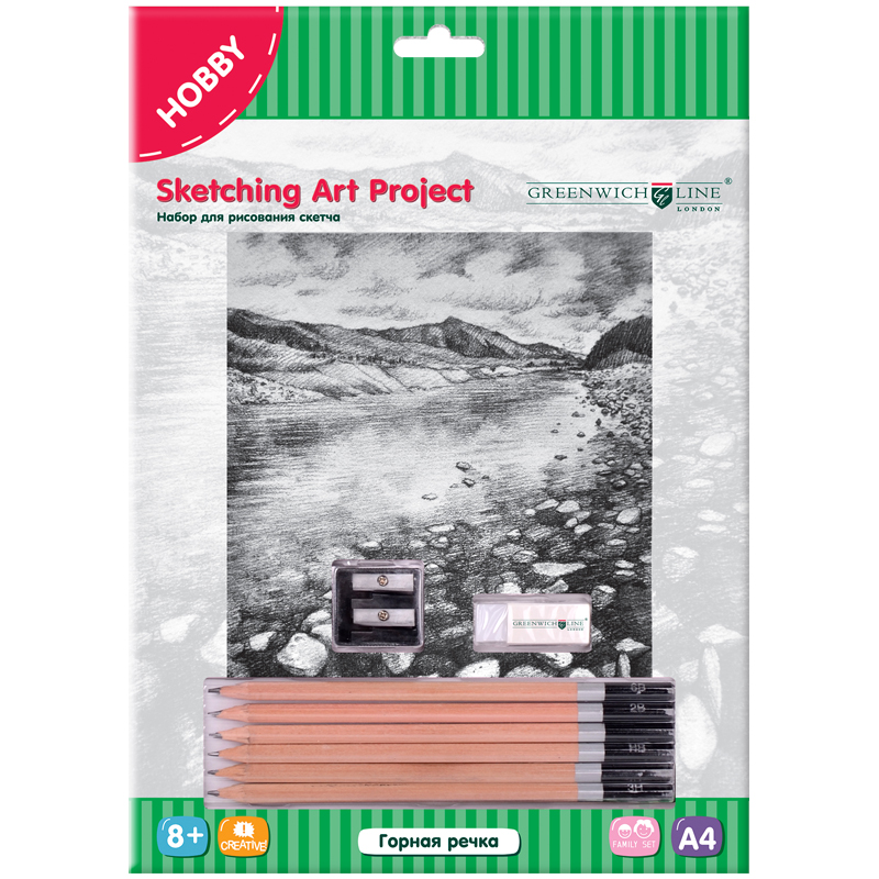 Набор для рисования скетча Greenwich Line "Горная речка", А4, карандаши, ластик, точилка, картон