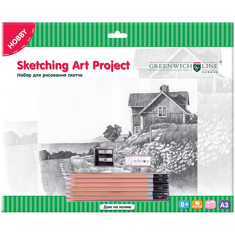 Набор для рисования скетча Greenwich Line "Дом на холме", А3, карандаши, ластик, точилка, картон