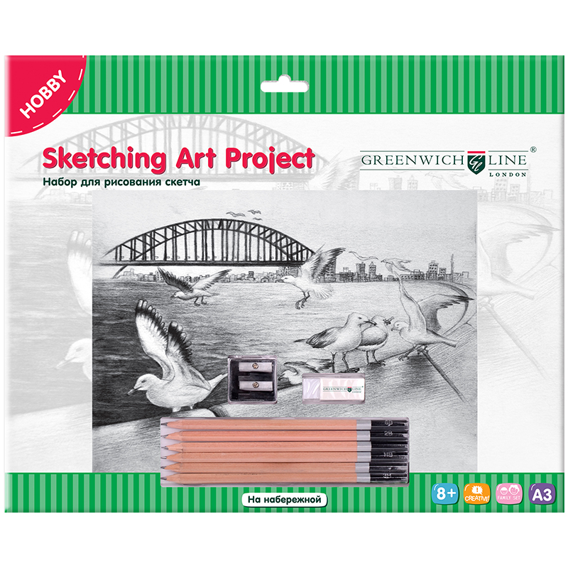Набор для рисования скетча Greenwich Line "На набережной", A3, карандаши, ластик, точилка, картон