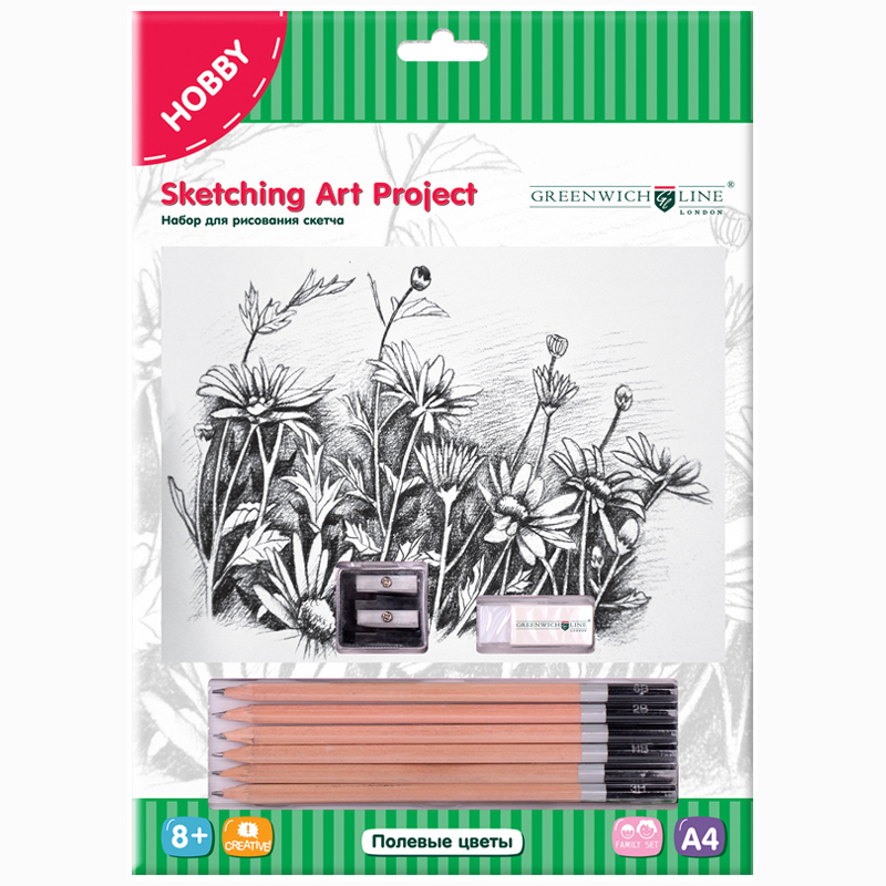 Набор для рисования скетча Greenwich Line "Полевые цветы", A4, карандаши, ластик, точилка, картон