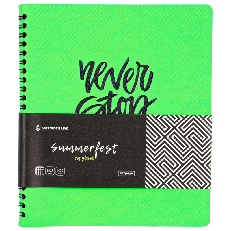Тетрадь 80л. А5, клетка, на гребне, ЛАЙТ, кожзам, Greenwich Line "Summerfest", неоновый лаймовый