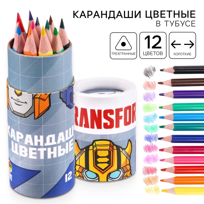Цветные карандаши в тубусе, 12 цветов, трехгранные, Трансформеры