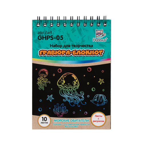 Гравюра-блокнот " Hobbius " Морские обитатели, 10*14см, с цветной основой, 10 заготовок для гравюр, основа с контуром рисунка, штихель, пакет, европодвес