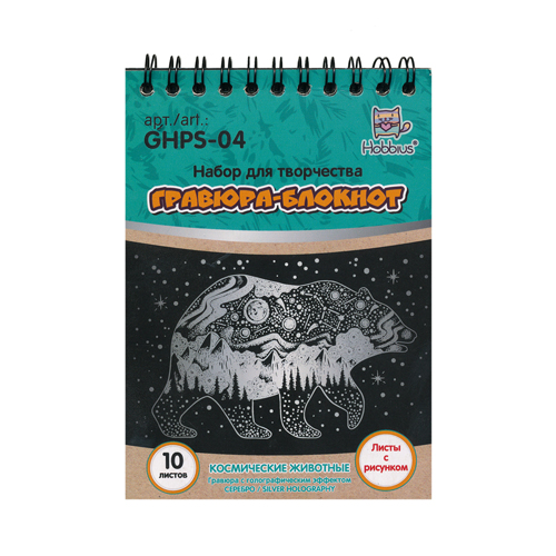 Гравюра-блокнот " Hobbius " Космические животные, 10*14см, с цветной основой, 10 заготовок для гравюр, основа с контуром рисунка, штихель, пакет, европодвес