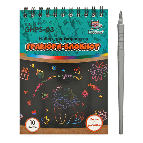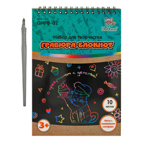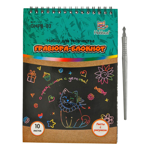 Гравюра-блокнот " Hobbius " Кот с бусами, 10*14см, с цветной основой, 10 заготовок для гравюр, основа с контуром рисунка, штихель, европодвес