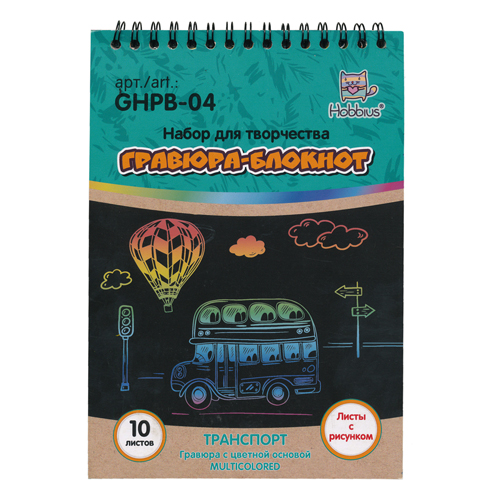 Гравюра-блокнот " Hobbius " Транспорт, 14*20см, с цветной основой, 10 заготовок для гравюр, основа с контуром рисунка, штихель, пакет, европодвес
