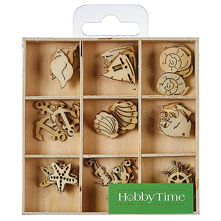 Декоративный набор " Hobby Time " №31 Морская фантазия (ассорти). Декор из дерева можно комбинировать с любыми материалами (текстилем, картоном, бумагой) для получения оригинальных изделий в технике скрапбукинг, в деревянном органайзере 10*10см