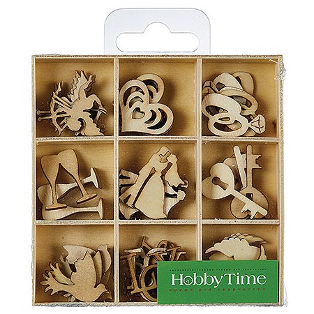 Декоративный набор " Hobby Time " №33 Романтическая фантазия (ассорти). Декор из дерева можно комбинировать с любыми материалами (текстилем, картоном, бумагой) для получения оригинальных изделий в технике скрапбукинг, в деревянном органайзере 10*10см