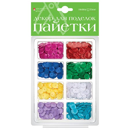 Декоративные пайетки " Hobby Time " №25 Цветные, 6мм, 8 цветов, пакет, европодвес