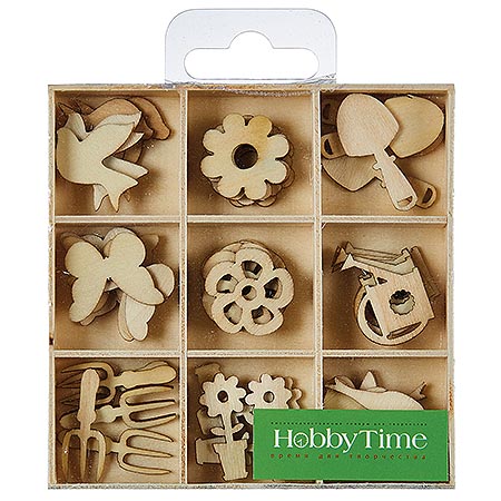 Декоративный набор " Hobby Time " №28 Весенняя фантазия (ассорти), декор из дерева можно комбинировать с любыми материалами (текстилем, картоном, бумагой) для получения оригинальных изделий в технике скрапбукинг, в деревянном органайзере 10*10см