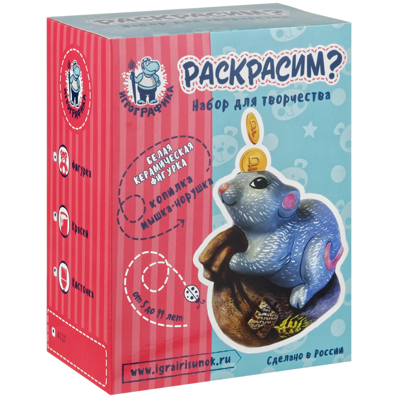 Набор для росписи фигурки из керамики Игрографика с акриловыми красками "Копилка. Мышь на мешке"