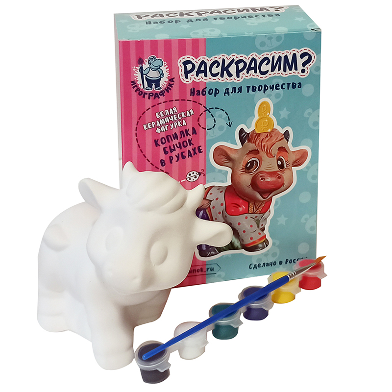 Набор для росписи фигурки из керамики Игрографика с акриловыми красками "Бычок в рубахе-копилка"
