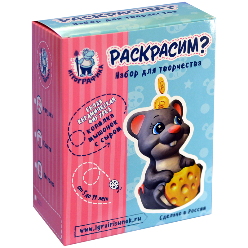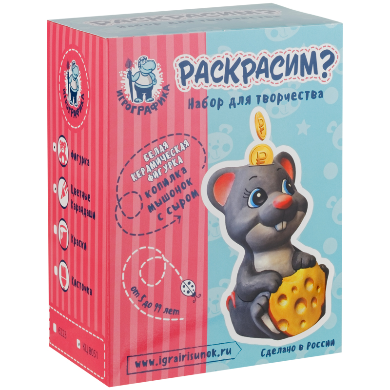 Набор для росписи фигурки из керамики Игрографика с цветными карандашами "Копилка. Мышонок с сыром"