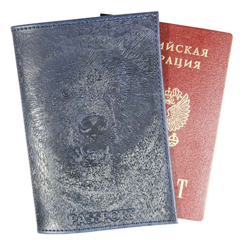 Обложка для паспорта " Имидж " Медведь 3D, синяя, натуральная кожа, сплошное блинтовое тиснение