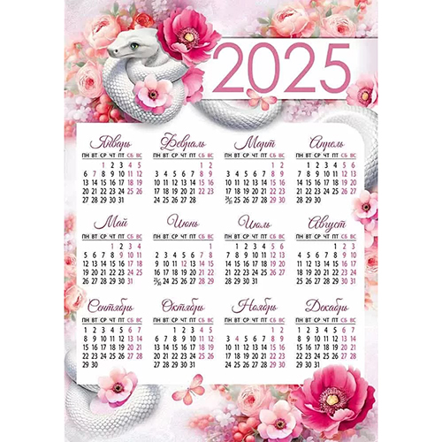 Календарь настенный " Империя поздравлений " 406 на 2025г 206*291мм Символ года- Белая змея в цветах, мелованная бумага, без отделки