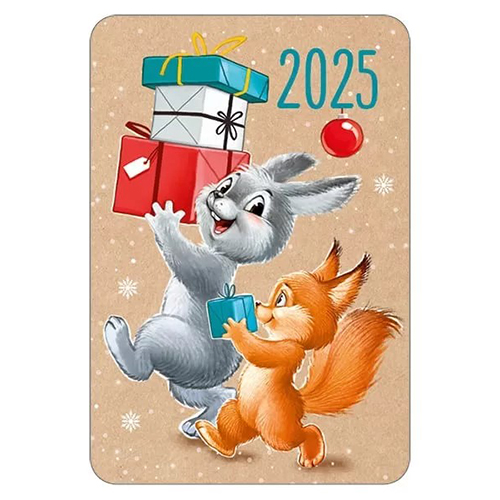 Календарь карманный " Империя поздравлений" 025 на 2025г 91*62мм, Зайка и бельчонок с подарками, без отделки, картон
