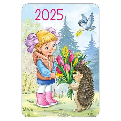 Календарь карманный " Империя поздравлений" 025 на 2025г 91*62мм, Девочка и ежик с букетом, без отделки, картон
