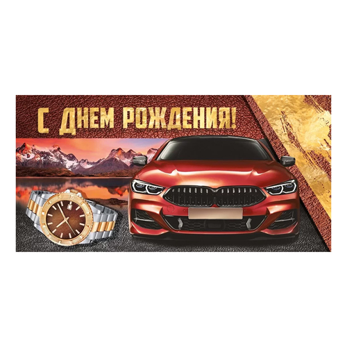 Конверт для денег " Империя поздравлений " 425 Мужской- С Днем рождения! Машина, часы, 168*84мм, блестки в лаке, текст