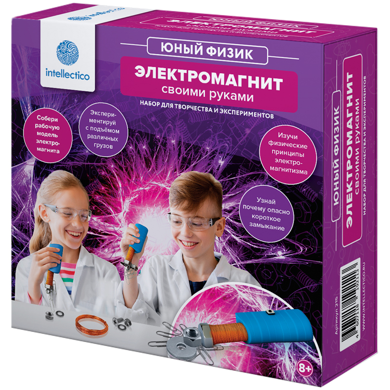Набор для опытов Intellectico "Юный физик. Электромагнит своими руками", картонная коробка