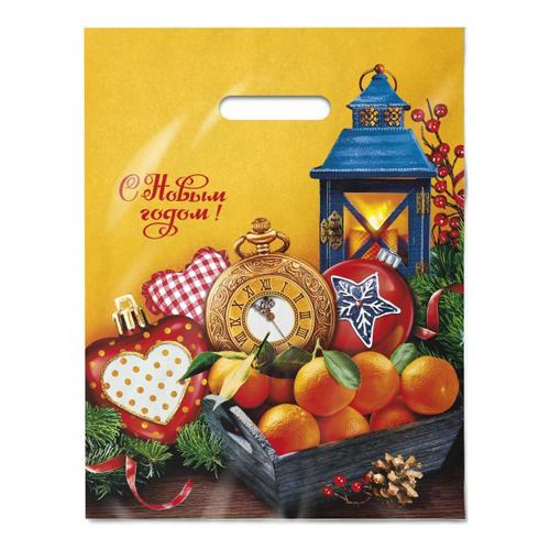 Пакет ПЭ " Интерпак " с вырубной ручкой ПВД, Новогодний- 31*40см 60мкм Мандарины