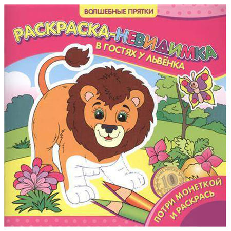 Раскраска-невидимка 205*205мм 4л В гостях у львенка, используя монетку, потереть белые силуэты и появятся звери, обложка - мелованная бумага