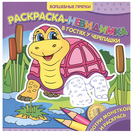Раскраска-невидимка 205*205мм 4л В гостях у черепашки, используя монетку, потереть белые силуэты и появятся звери, обложка - мелованная бумага