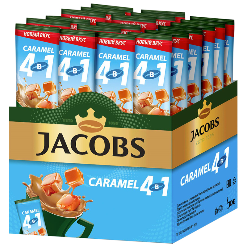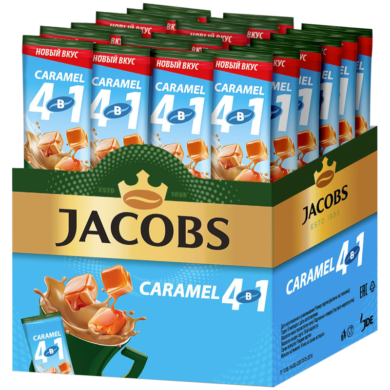 Кофе растворимый Jacobs "Caramel", со вкусом карамели, 4в1, порционный 24 пакетика*13,5г