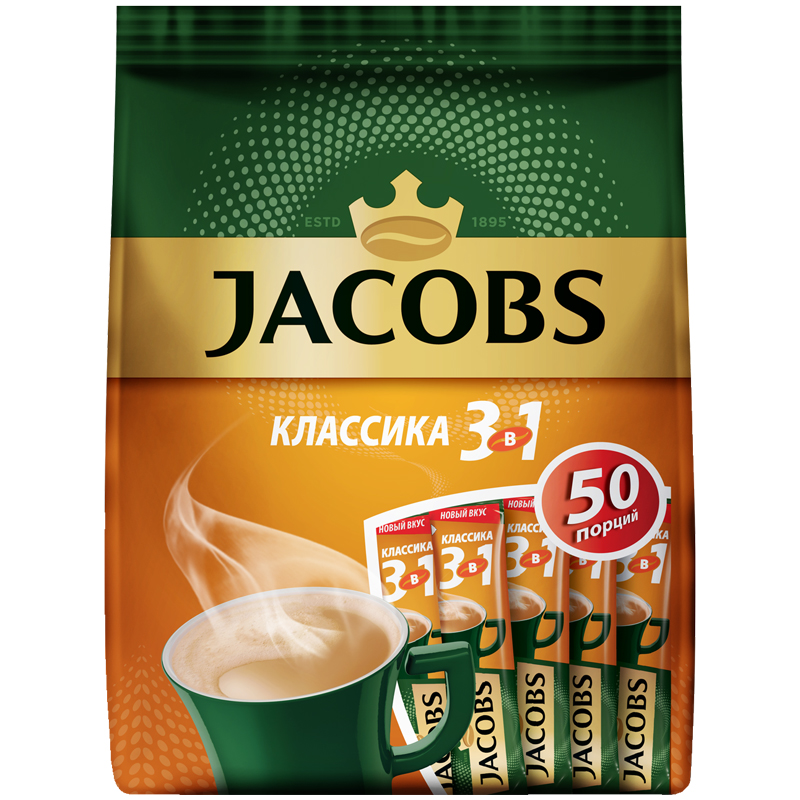 Кофе растворимый Jacobs "Классика", 3в1, порошкообразный, порционный, 50 пакетиков*12г, пакет