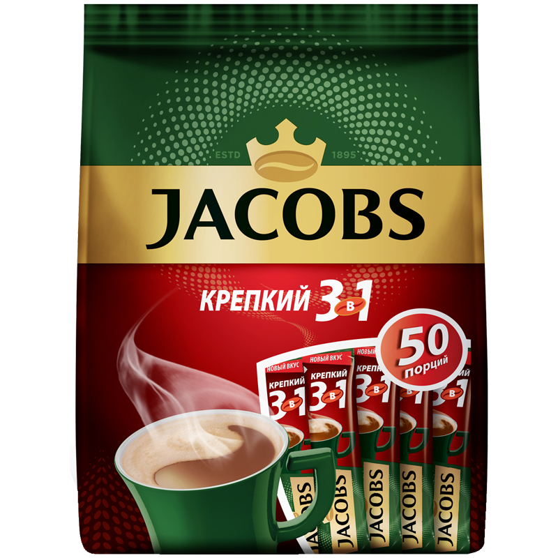 Кофе растворимый Jacobs "Крепкий", 3в1, порошкообразный, порционный, 50 пакетиков*12г, пакет