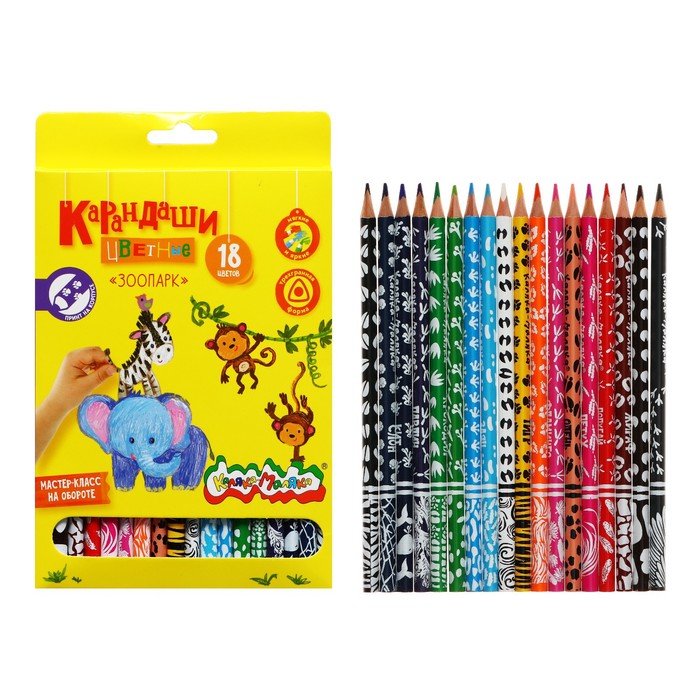Карандаши 18 цветов "Зоопарк" Каляка-Маляка, трехгранные, с принтом на корпусе, дерево