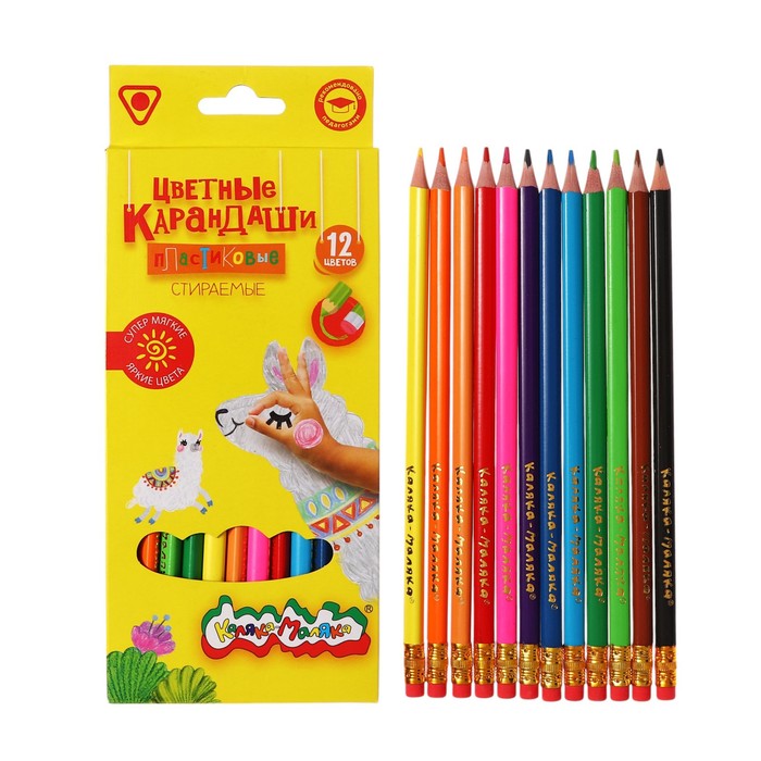 Карандаши 12 цветов "Каляка-Маляка" СТИРАЕМЫЕ, с ластиком, трехгранные, пластиковый корпус