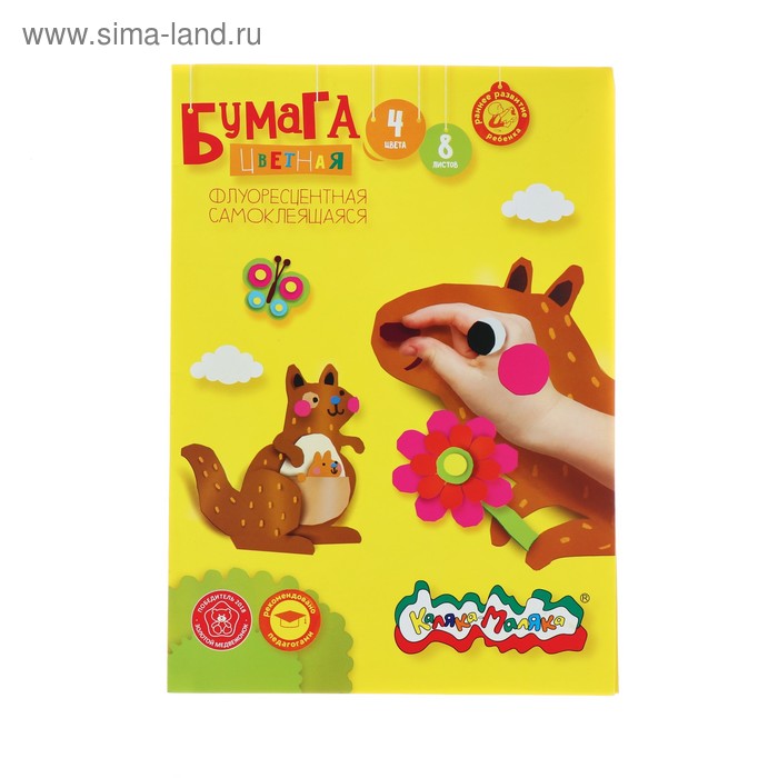 Бумага цветная самоклеящаяся А4, 8 листов, 4 цвета «Каляка-Маляка», флуоресцентная
