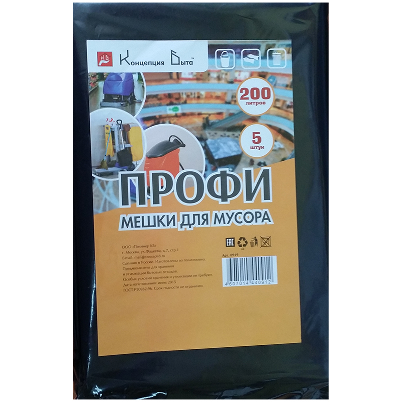 Мешки для мусора 200л КБ "Профи" ПВД, 87*130см, 65мкм, 5шт., суперпрочные, черные, в пластах