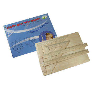 Набор для черчения " Можга " (тип 3) комплект: рейсшина, треугольник 45х180, треугольник 30х230, линейка 30 см, линейка справочная геометрическая , линейка масштабная 1:4, планшет А4, в картонной коробке, принадлежности выполнены из дерева