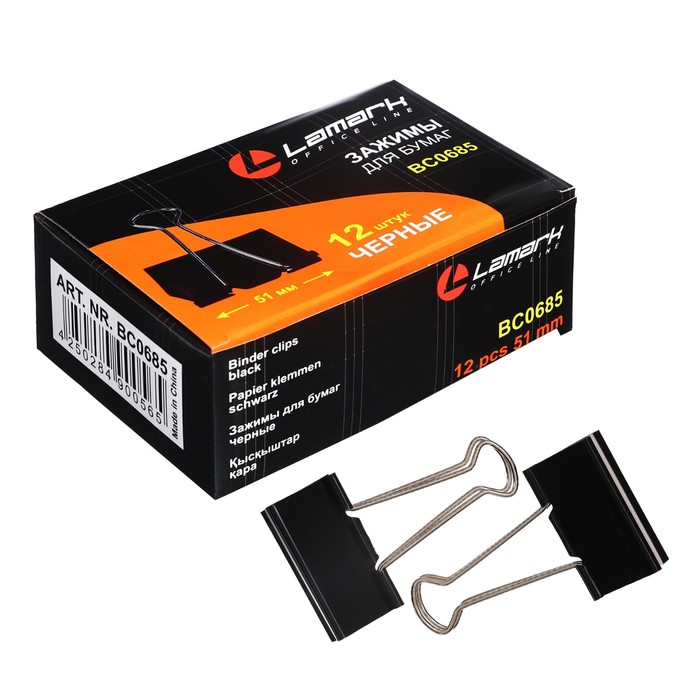 Набор зажимов для бумаг 51 мм, 12 штук, в упаковке, чёрные