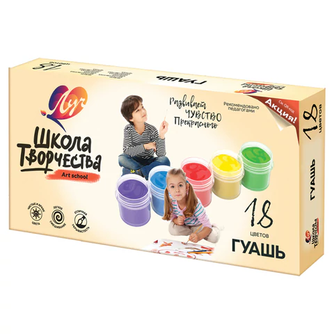 Гуашь ЛУЧ "Школа творчества", 18 цветов по 20 мл, без кисти, картонная упаковка, 29С 1754-08
