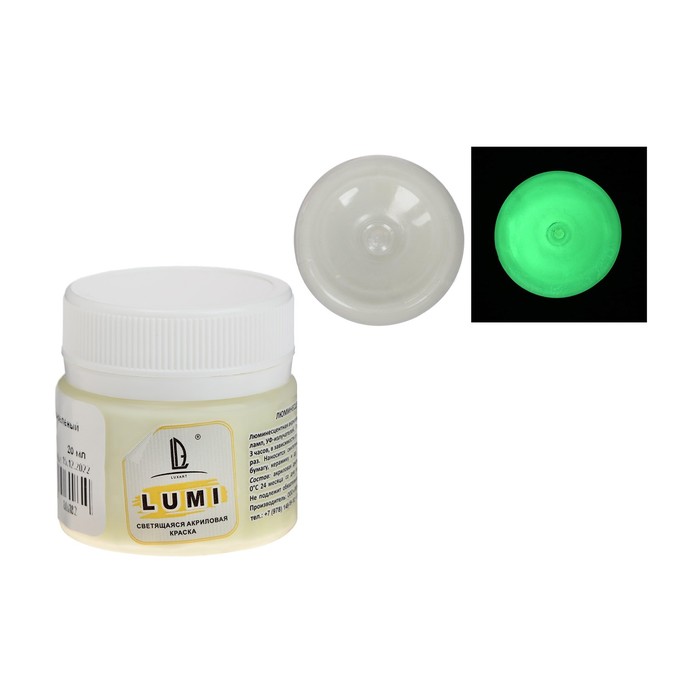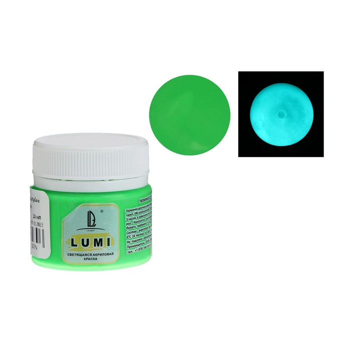 Краска акриловая люминесцентная (светящаяся в темноте), LUXART Lumi, 20 мл, сине-зелёный, сине-зелёное свечение (L3V20)