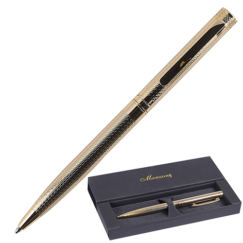 Ручка шариковая " Manzoni " Treviso синяя 1мм, поворотный механизм, металлический золотистый корпус, толщина письма 0,50, футляр кожзам