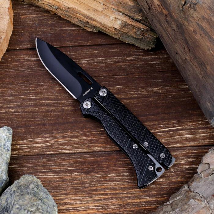 Нож-бабочка "Мастер К", лезвие 7,3см, черный, рукоять чешуя с полосками 8,5см,