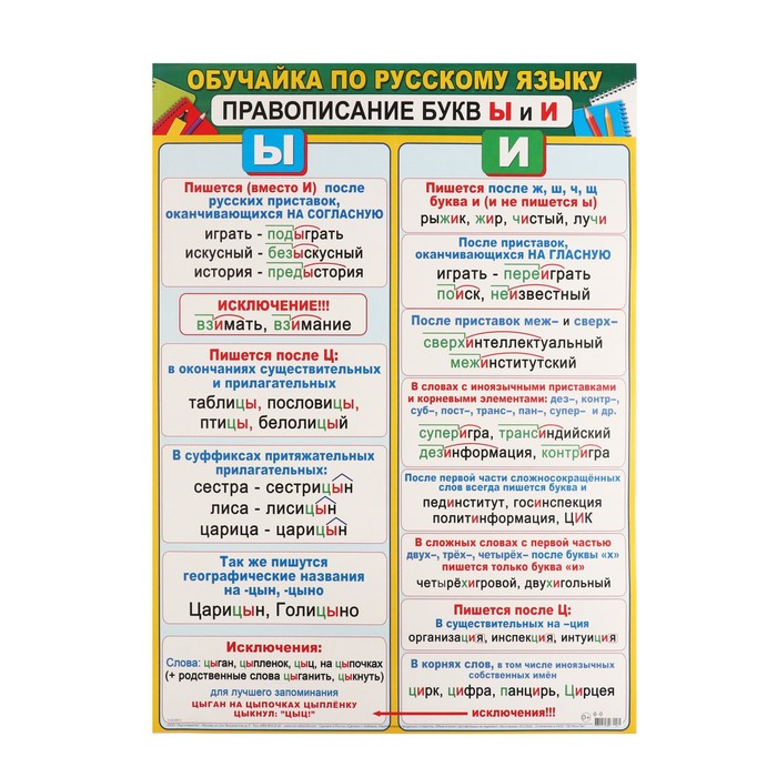 Плакат "Обучайка по Русскому языку. Правописание букв Ы и И" 50,5х69,7 см