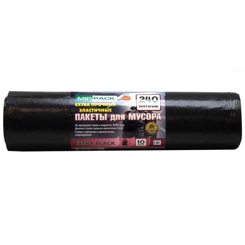 Мешки для мусора 240л Mirpack "Extra black" ПВД, 90*130см, 55мкм, 10шт., черные, в рулоне
