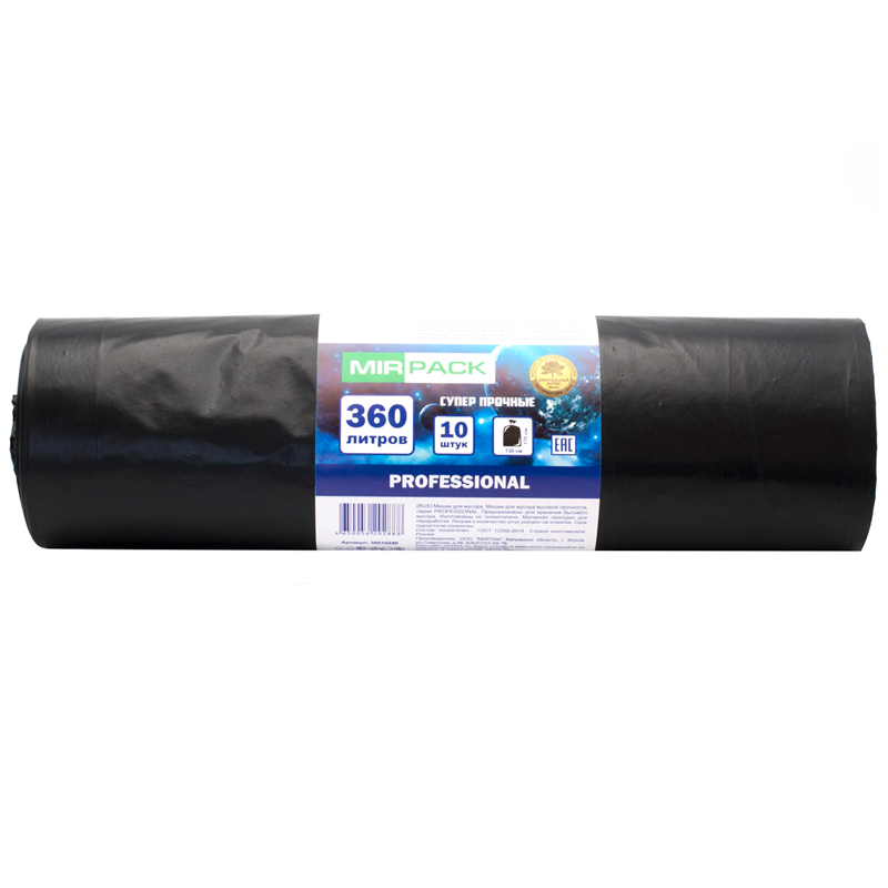 Мешки для мусора 360л Mirpack "Professional" ПВД, 130*170см, 70мкм, 10шт., черные, в рулоне