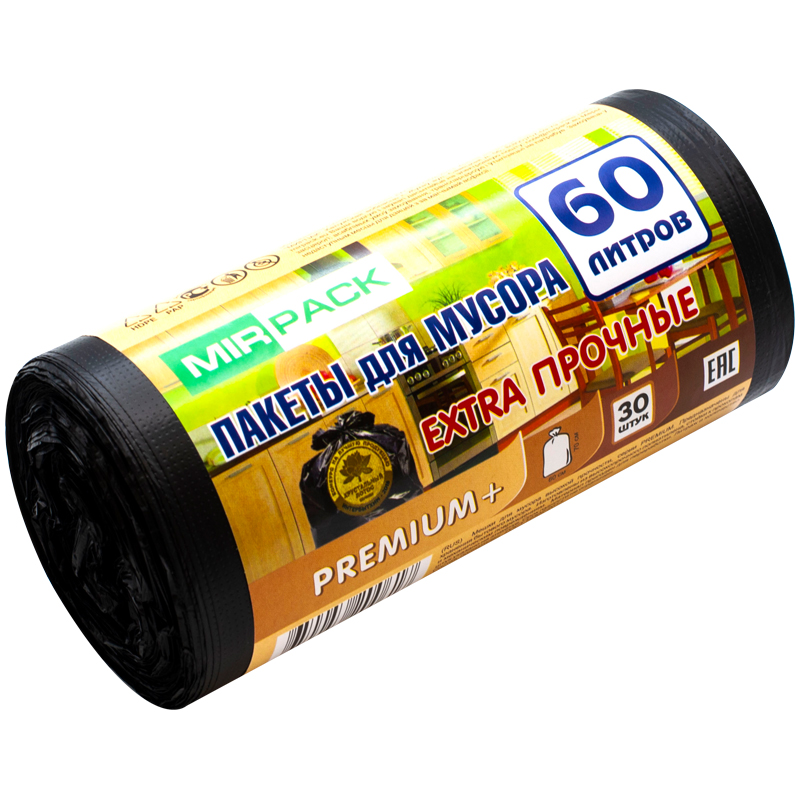 Мешки для мусора 60л Mirpack "Premium+" ПСД, 60*70см, 20мкм, 30шт., черные, в рулоне