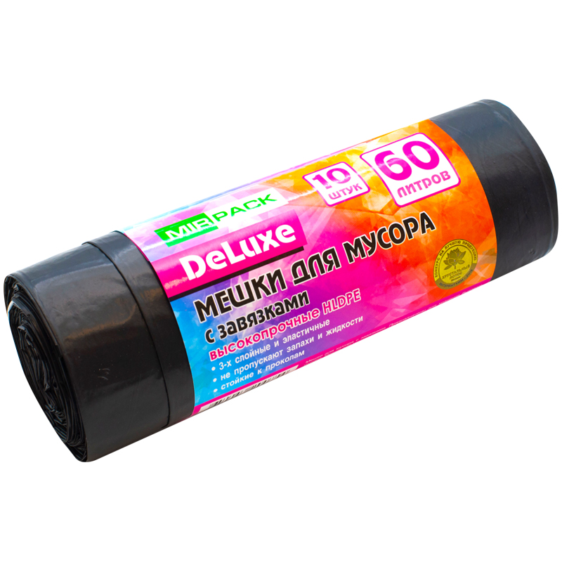 Мешки для мусора 60л Mirpack "Deluxe" ПВД, 60*70см, 35мкм, 10шт., черные, в рулоне, с завязками
